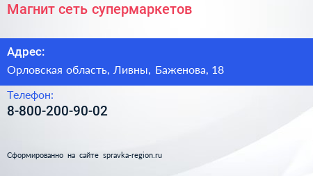 Магнит, сеть супермаркетов по адресу Орловская область, Ливны, Баженова, 18 в дальнейшем Организация, размещена в следующих категориях: