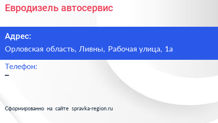Евродизель, автосервис по адресу Орловская область, Ливны, Рабочая улица, 1а в дальнейшем Организация, размещена в следующих категориях: