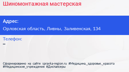 Шиномонтажная мастерская по адресу Орловская область, Ливны, Заливенская, 134 в дальнейшем Организация, размещена в следующих категориях: