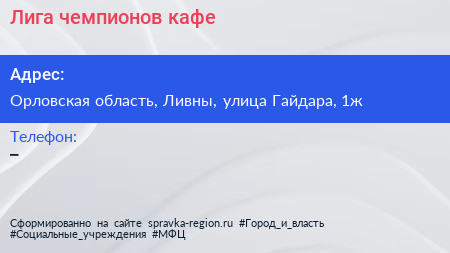 Лига чемпионов, кафе по адресу Орловская область, Ливны, улица Гайдара, 1ж в дальнейшем Организация, размещена в следующих категориях:
