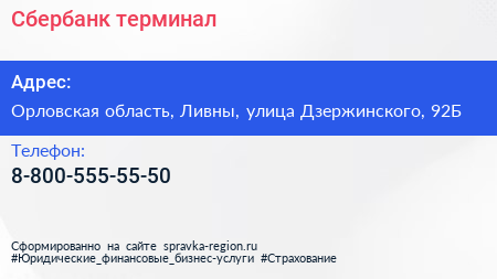 Сбербанк, терминал по адресу Орловская область, Ливны, улица Дзержинского, 92Б в дальнейшем Организация, размещена в следующих категориях: