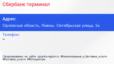 Сбербанк, терминал по адресу Орловская область, Ливны, Октябрьская улица, 5а в дальнейшем Организация, размещена в следующих категориях: