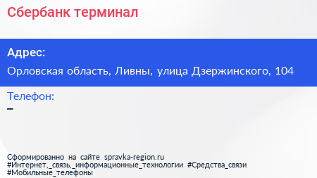 Сбербанк, терминал по адресу Орловская область, Ливны, улица Дзержинского, 104 в дальнейшем Организация, размещена в следующих категориях: