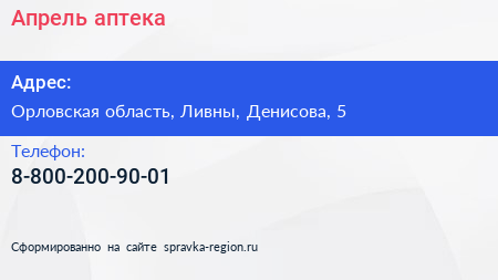 Апрель, аптека по адресу Орловская область, Ливны, Денисова, 5 в дальнейшем Организация, размещена в следующих категориях: