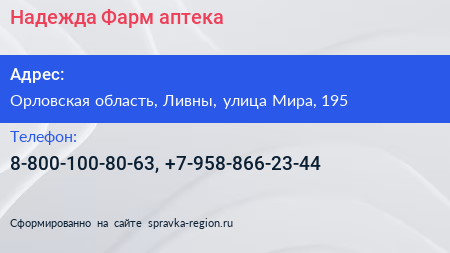 Надежда-Фарм, аптека по адресу Орловская область, Ливны, улица Мира, 195 в дальнейшем Организация, размещена в следующих категориях: