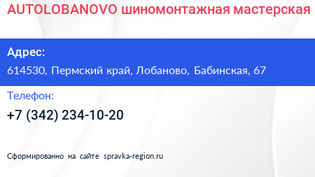 AUTOLOBANOVO, шиномонтажная мастерская по адресу 614530, Пермский край, Лобаново, Бабинская, 67 в дальнейшем Организация, размещена в следующих категориях: