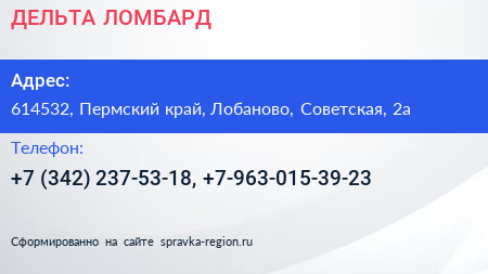ДЕЛЬТА ЛОМБАРД по адресу 614532, Пермский край, Лобаново, Советская, 2а в дальнейшем Организация, размещена в следующих категориях: