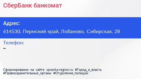 СберБанк, банкомат по адресу 614530, Пермский край, Лобаново, Сибирская, 28 в дальнейшем Организация, размещена в следующих категориях: