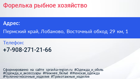 Форелька, рыбное хозяйство по адресу Пермский край, Лобаново, Восточный обход 29 км, 1 в дальнейшем Организация, размещена в следующих категориях: