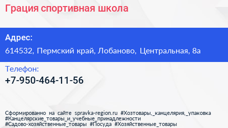 Грация, спортивная школа по адресу 614532, Пермский край, Лобаново, Центральная, 8а в дальнейшем Организация, размещена в следующих категориях:
