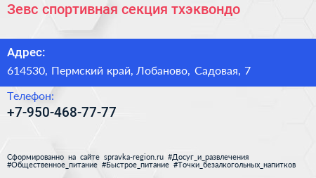 Зевс, спортивная секция тхэквондо по адресу 614530, Пермский край, Лобаново, Садовая, 7 в дальнейшем Организация, размещена в следующих категориях: