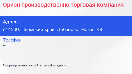 Орион, производственно-торговая компания по адресу 614530, Пермский край, Лобаново, Новая, 48 в дальнейшем Организация, размещена в следующих категориях: