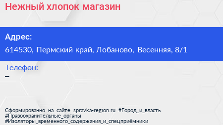 Нежный хлопок, магазин по адресу 614530, Пермский край, Лобаново, Весенняя, 8/1 в дальнейшем Организация, размещена в следующих категориях: