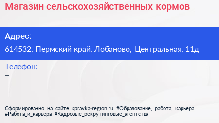 Магазин сельскохозяйственных кормов по адресу 614532, Пермский край, Лобаново, Центральная, 11д в дальнейшем Организация, размещена в следующих категориях: