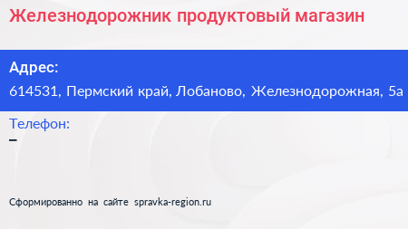 Железнодорожник, продуктовый магазин по адресу 614531, Пермский край, Лобаново, Железнодорожная, 5а в дальнейшем Организация, размещена в следующих категориях: