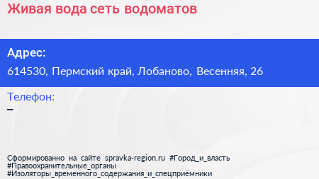 Живая вода, сеть водоматов по адресу 614530, Пермский край, Лобаново, Весенняя, 26 в дальнейшем Организация, размещена в следующих категориях: