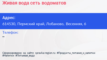 Живая вода, сеть водоматов по адресу 614530, Пермский край, Лобаново, Весенняя, 6 в дальнейшем Организация, размещена в следующих категориях:
