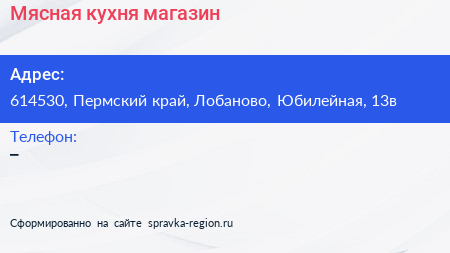 Мясная кухня, магазин по адресу 614530, Пермский край, Лобаново, Юбилейная, 13в в дальнейшем Организация, размещена в следующих категориях: