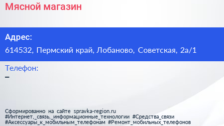 Мясной магазин по адресу 614532, Пермский край, Лобаново, Советская, 2а/1 в дальнейшем Организация, размещена в следующих категориях:
