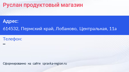 Руслан, продуктовый магазин по адресу 614532, Пермский край, Лобаново, Центральная, 11а в дальнейшем Организация, размещена в следующих категориях: