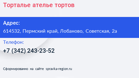 Торталье, ателье тортов по адресу 614532, Пермский край, Лобаново, Советская, 2а в дальнейшем Организация, размещена в следующих категориях: