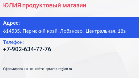 ЮЛИЯ, продуктовый магазин по адресу 614535, Пермский край, Лобаново, Центральная, 18а в дальнейшем Организация, размещена в следующих категориях: