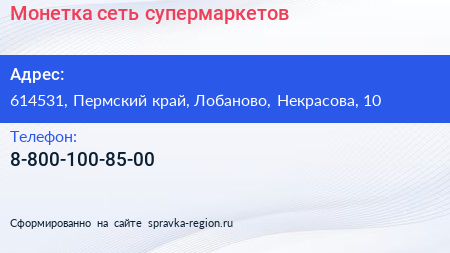 Монетка, сеть супермаркетов по адресу 614531, Пермский край, Лобаново, Некрасова, 10 в дальнейшем Организация, размещена в следующих категориях: