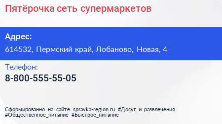 Пятёрочка, сеть супермаркетов по адресу 614532, Пермский край, Лобаново, Новая, 4 в дальнейшем Организация, размещена в следующих категориях: