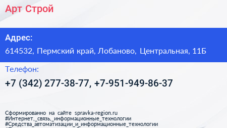 Арт-Строй по адресу 614532, Пермский край, Лобаново, Центральная, 11Б в дальнейшем Организация, размещена в следующих категориях: