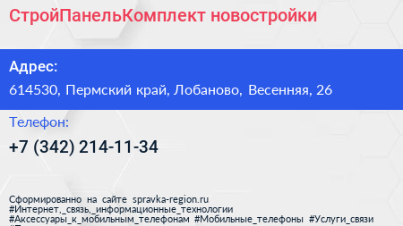 СтройПанельКомплект, новостройки по адресу 614530, Пермский край, Лобаново, Весенняя, 26 в дальнейшем Организация, размещена в следующих категориях: