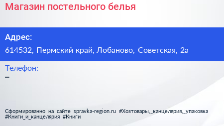 Магазин постельного белья по адресу 614532, Пермский край, Лобаново, Советская, 2а в дальнейшем Организация, размещена в следующих категориях: