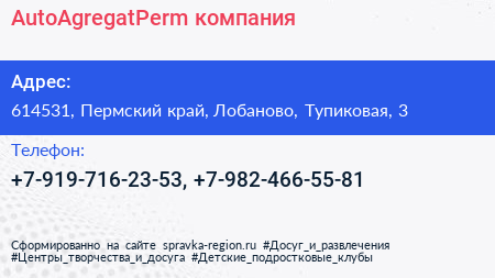 AutoAgregatPerm, компания по адресу 614531, Пермский край, Лобаново, Тупиковая, 3 в дальнейшем Организация, размещена в следующих категориях: