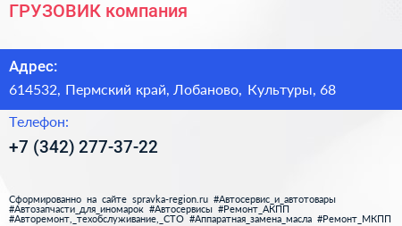 ГРУЗОВИК, компания по адресу 614532, Пермский край, Лобаново, Культуры, 68 в дальнейшем Организация, размещена в следующих категориях: