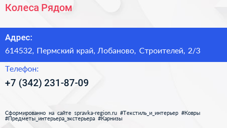 Колеса Рядом по адресу 614532, Пермский край, Лобаново, Строителей, 2/3 в дальнейшем Организация, размещена в следующих категориях: