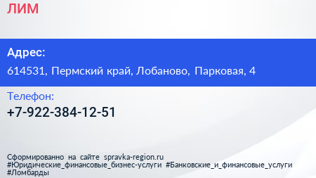 ЛИМ по адресу 614531, Пермский край, Лобаново, Парковая, 4 в дальнейшем Организация, размещена в следующих категориях: