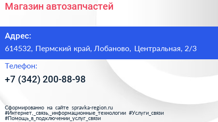Магазин автозапчастей по адресу 614532, Пермский край, Лобаново, Центральная, 2/3 в дальнейшем Организация, размещена в следующих категориях: