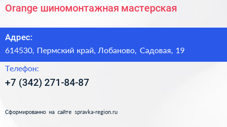 Orange, шиномонтажная мастерская по адресу 614530, Пермский край, Лобаново, Садовая, 19 в дальнейшем Организация, размещена в следующих категориях: