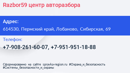Razbor59, центр авторазбора по адресу 614530, Пермский край, Лобаново, Сибирская, 69 в дальнейшем Организация, размещена в следующих категориях: