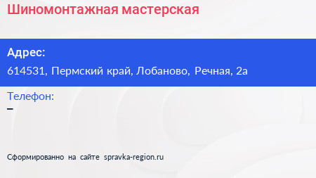 Шиномонтажная мастерская по адресу 614531, Пермский край, Лобаново, Речная, 2а в дальнейшем Организация, размещена в следующих категориях:
