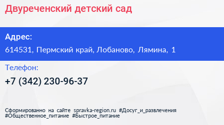 Двуреченский детский сад по адресу 614531, Пермский край, Лобаново, Лямина, 1 в дальнейшем Организация, размещена в следующих категориях: