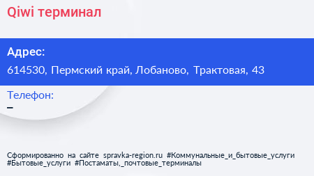 Qiwi, терминал по адресу 614530, Пермский край, Лобаново, Трактовая, 43 в дальнейшем Организация, размещена в следующих категориях: