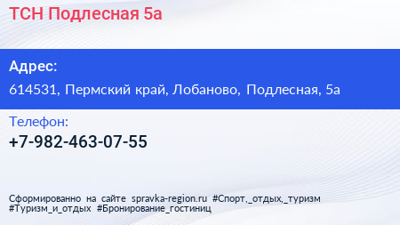 ТСН Подлесная, 5а по адресу 614531, Пермский край, Лобаново, Подлесная, 5а в дальнейшем Организация, размещена в следующих категориях: