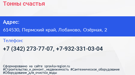Тонны счастья по адресу 614530, Пермский край, Лобаново, Озёрная, 2 в дальнейшем Организация, размещена в следующих категориях: