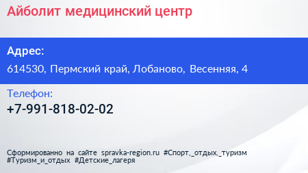 Айболит, медицинский центр по адресу 614530, Пермский край, Лобаново, Весенняя, 4 в дальнейшем Организация, размещена в следующих категориях: