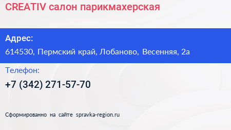 CREATIV, салон-парикмахерская по адресу 614530, Пермский край, Лобаново, Весенняя, 2а в дальнейшем Организация, размещена в следующих категориях: