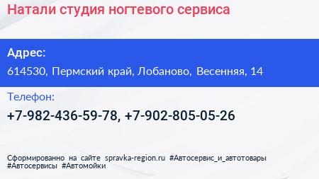 Натали, студия ногтевого сервиса по адресу 614530, Пермский край, Лобаново, Весенняя, 14 в дальнейшем Организация, размещена в следующих категориях:
