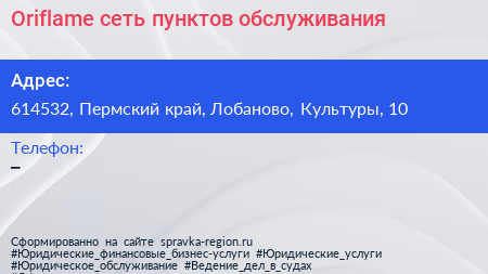 Oriflame, сеть пунктов обслуживания по адресу 614532, Пермский край, Лобаново, Культуры, 10 в дальнейшем Организация, размещена в следующих категориях:
