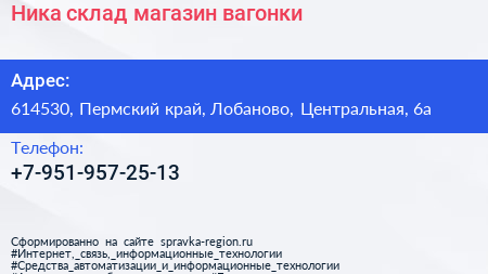 Ника, склад-магазин вагонки по адресу 614530, Пермский край, Лобаново, Центральная, 6а в дальнейшем Организация, размещена в следующих категориях: