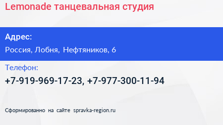 Lemonade, танцевальная студия по адресу Нефтяник, 6, улица Нефтяников, Посёлок Нефтебазы, Павельцево, Долгопрудный, городской округ Долгопрудный, Московская область, Центральный федеральный округ, 141720, Россия в дальнейшем Организация, размещена в следующих категориях: