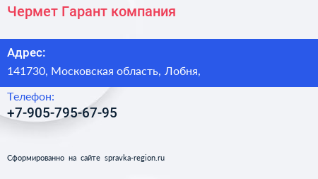 Чермет Гарант, компания по адресу 141730, Московская область, Лобня, в дальнейшем Организация, размещена в следующих категориях: